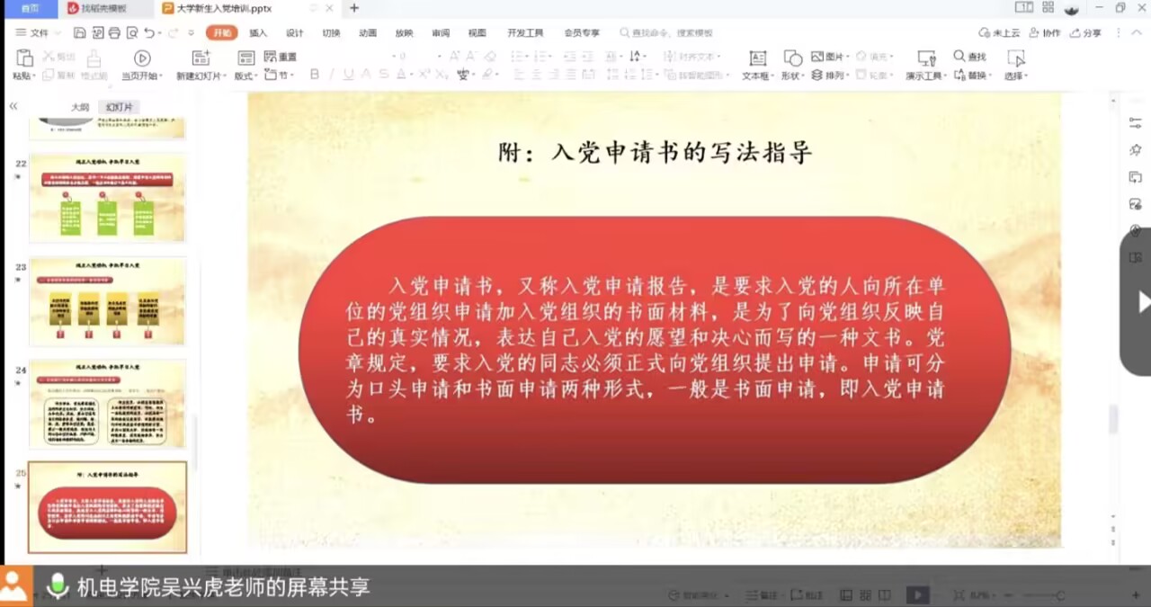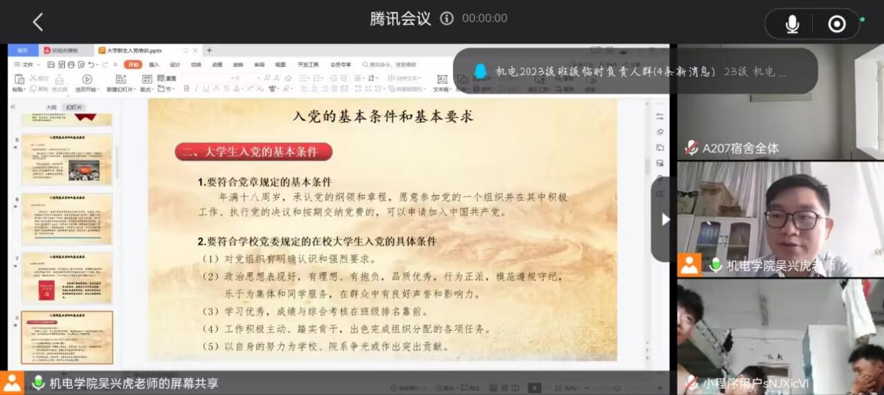 最后,针对如何写好入党申请书这一关键环节,吴兴虎老师做了认真指导:一是格式要正确。申请书一般包括标题、称谓、正文和落款。二是正文要充实。正文一般包括对党的认识、入党动机、入党决心和今后努力方向、个人和家庭基本情况。三是内容要与时俱进。要认真研读党章,及时学习党的创新理论最新成果,要联系自己的思想实际谈对党的认识,切忌照搬照抄,空话连篇。他希望2023级全体新生要扎实学习科学文化知识,努力进取,力争优秀;要善于利用大学的学习、活动来锻炼自己,提高自己的综合素质;要主动学习习近平新时代中国特色社会主义思想,不断增强“四个意识”、坚定“四个自信”、做到“两个维护”,以实际行动勇做新时代合格老员工。