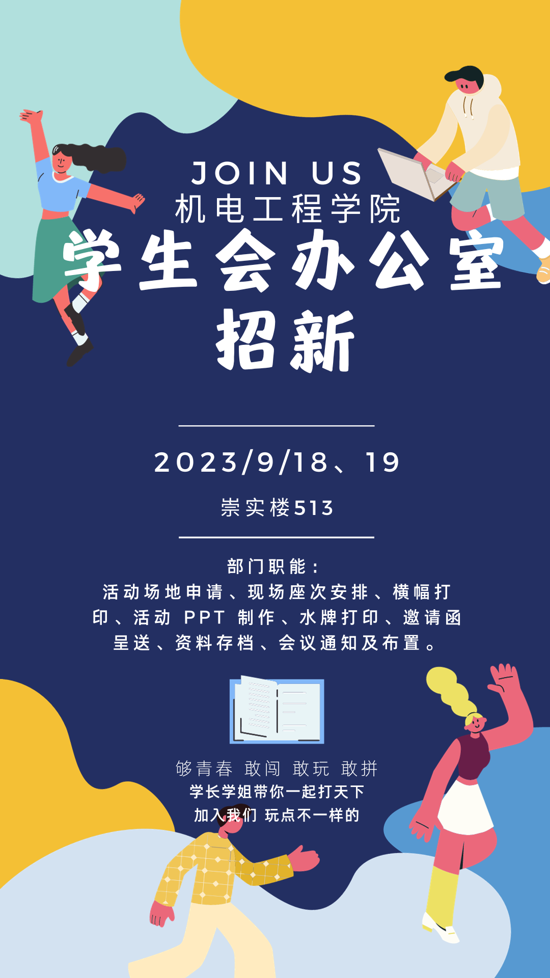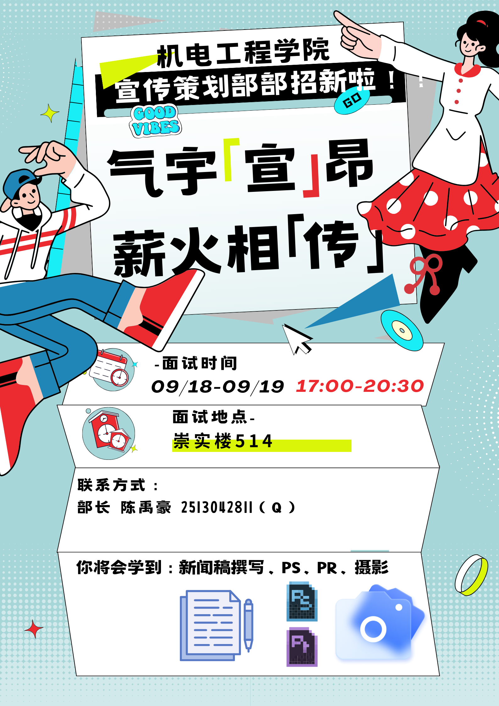 宣传策划部主要职责:活动海报的制作、活动视频的制作、进行活动照片的采集、新闻稿的撰写、公司公众号的管理,签到表的绘制。